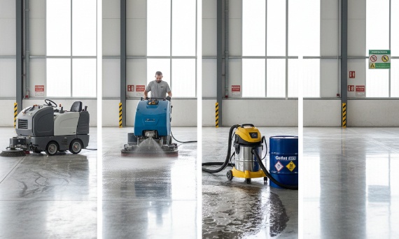 Odkurzacze Przemysłowe (Mokro/Sucho): Niezastąpione do usuwania brudu po zamiataniu (Krok 1) oraz do zbierania roztworu po gruntownym myciu (Krok 3).
