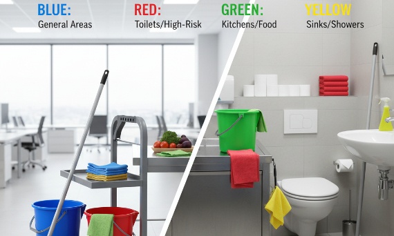 Zestawy Ściereczek i Mopów w Różnych Kolorach: To podstawa! Upewnij się, że ściereczki do konkretnych stref są wyraźnie oznaczone kolorem i przeznaczone tylko do nich. Materiały takie jak mikrofibra są idealne ze względu na ich skuteczność i trwałość.